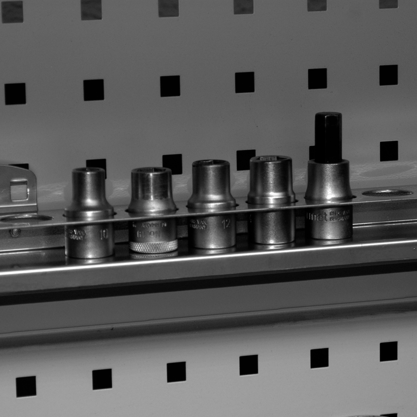 Nosilec nasadnih ključev nudi pregledno razvrščanje po velikosti, hiter dostop in boljšo preglednost delovne postaje.