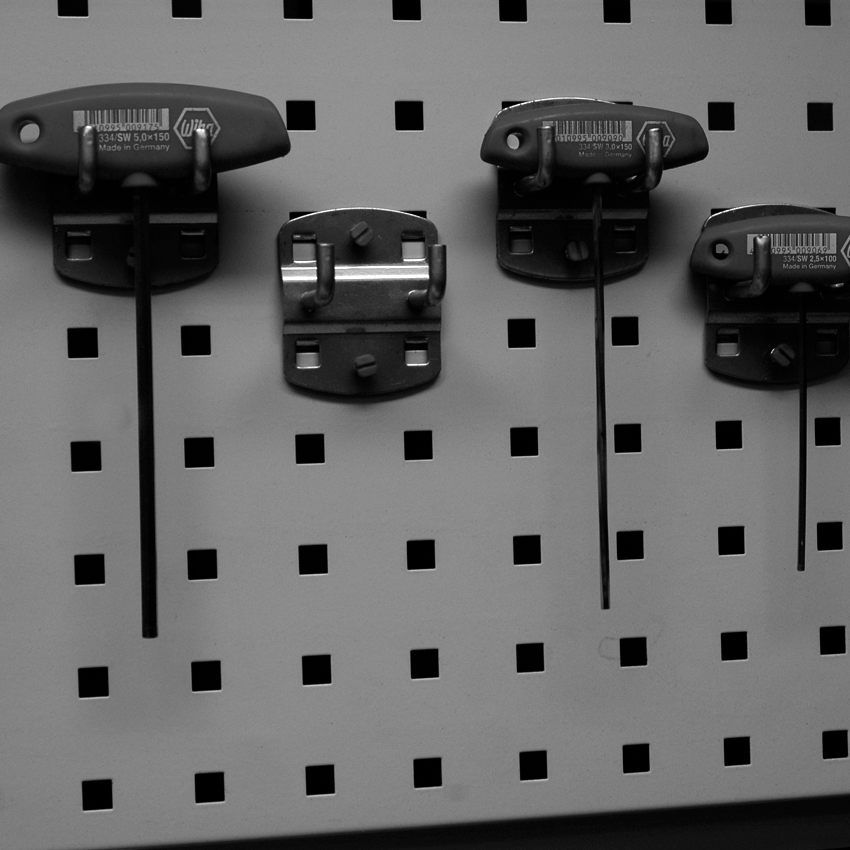 Dvojni nosilec z ravnim kavljem omogoča fleksibilno shranjevanje različnih vrst orodja in večjo preglednost delovne plošče.