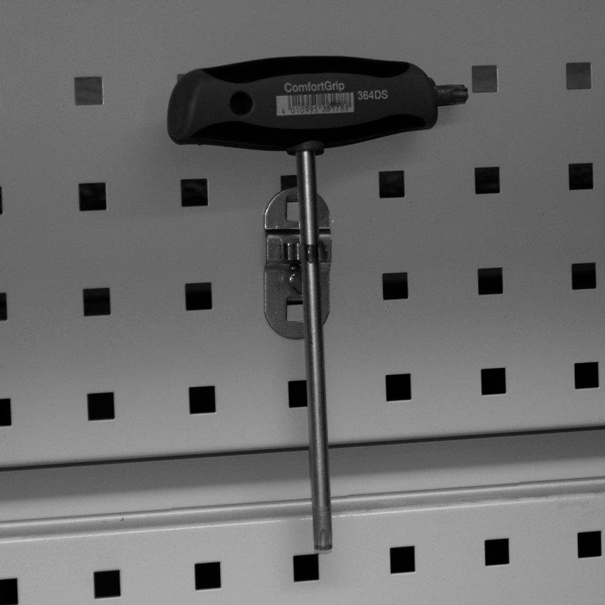 Stenski nosilec za orodje omogoča hitro pripenjanje in odstranjevanje, boljšo preglednost ter varno shranjevanje orodja.