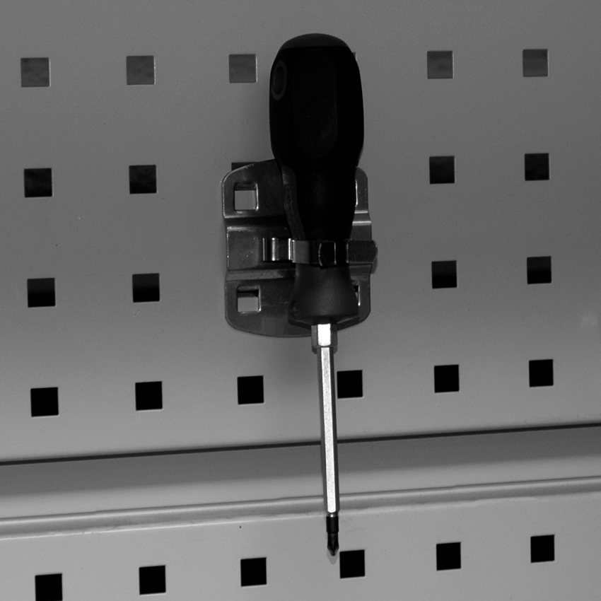Stenski nosilec za orodje omogoča varno pritrditev, hiter dostop in pregledno shranjevanje različnih vrst orodja.