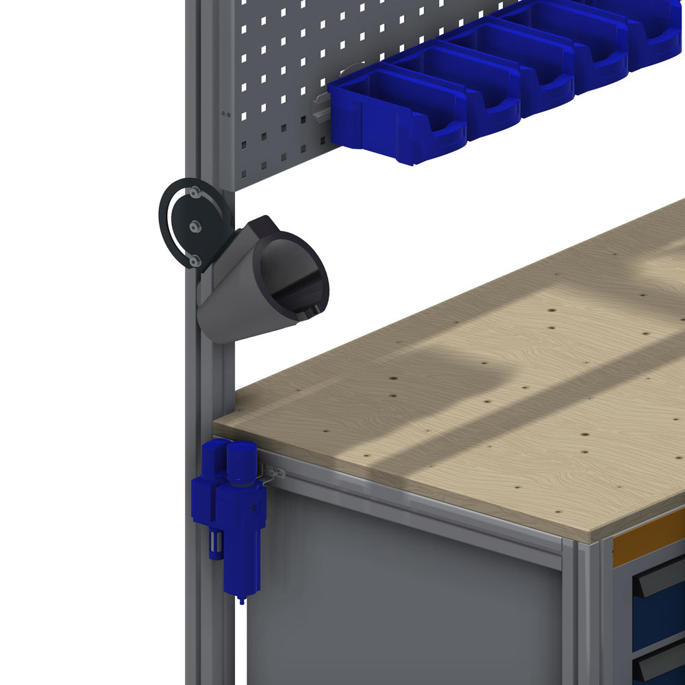 Držalo za orodje S omogoča varno shranjevanje vrtalnikov, akumulatorskih izvijačev in drugega orodja z nastavljivim kotom za lažji dostop.