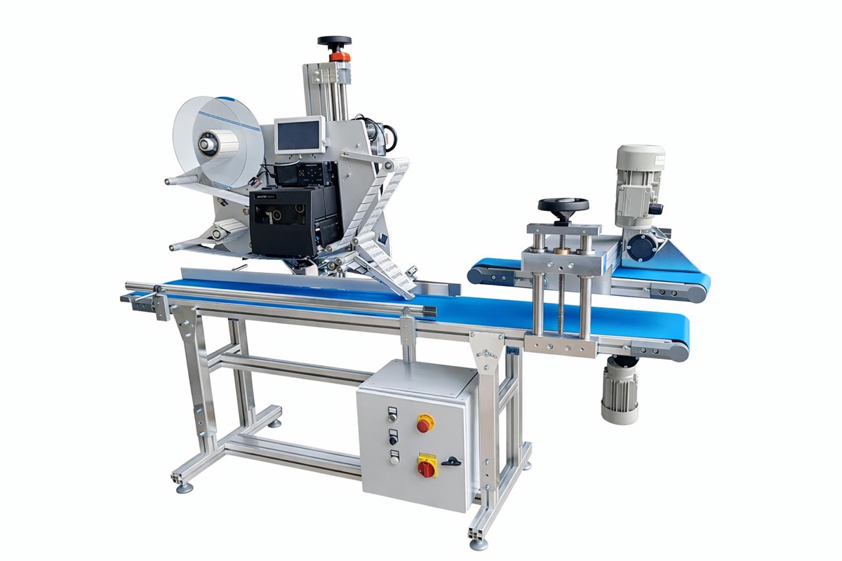 Tračni transporter z etiketirko na 2 osni linearni enoti za fino nastavitev ter transporterjem za glajenje etiket