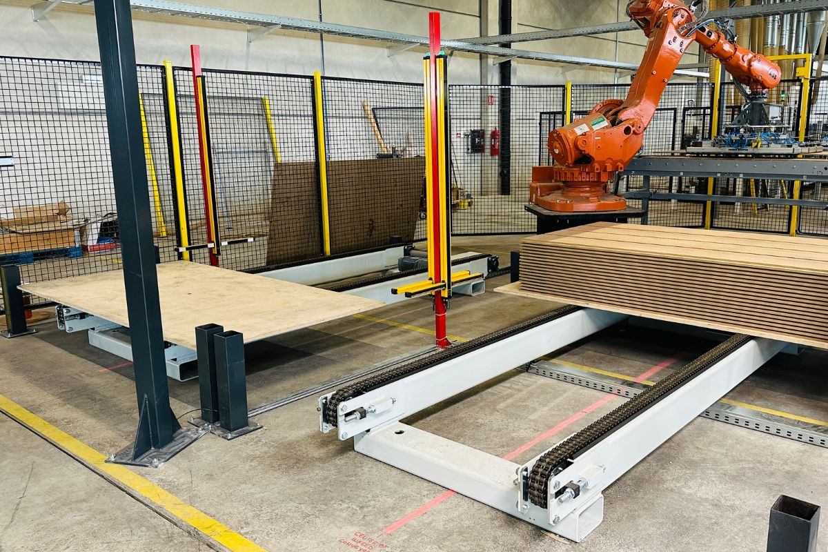 Verižni transporter za prenos težjih palet s parketom v lesni industriji