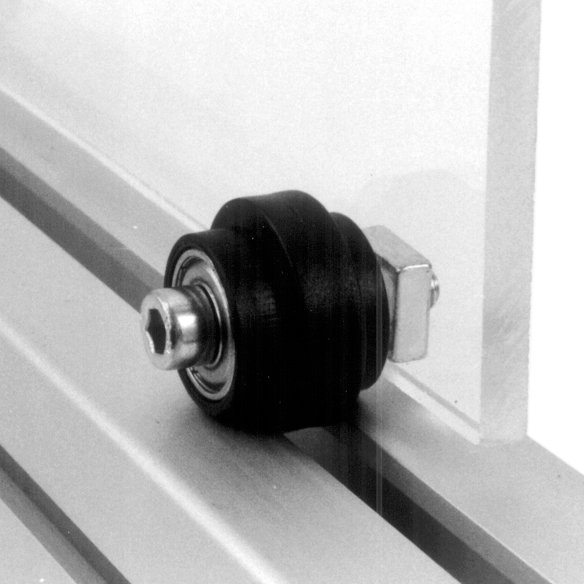 Valjčni element za zanesljivo vodenje drsnih, dvižnih vrat in predalov v aluminijastih konstrukcijah ter profilnih sistemih.