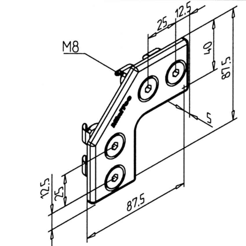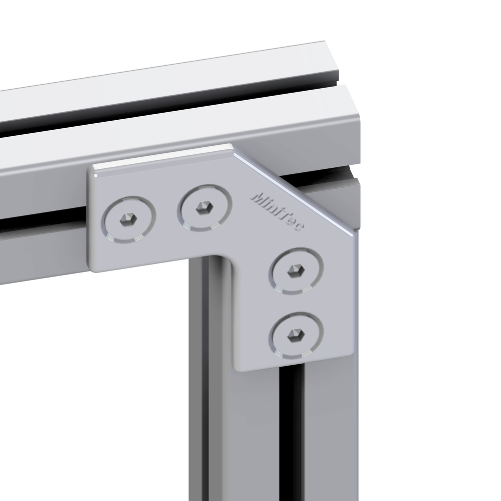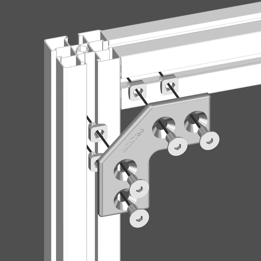 Kotna vezna ploščica iz nerjavečega jekla za utrjevanje alu konstrukcij. Primerna tudi za križne spoje.