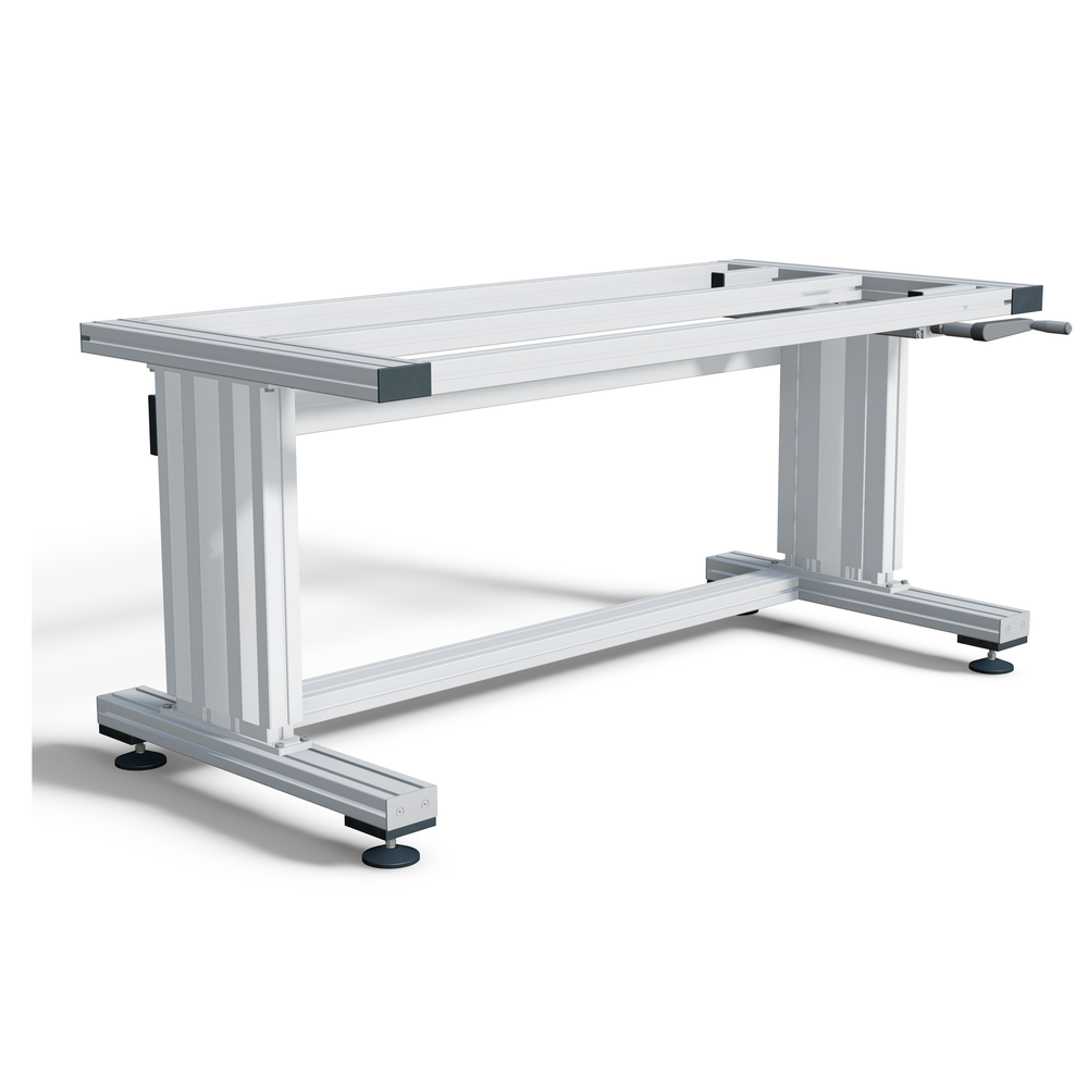 • Nastavitev višine: Ročna črpalka z zložljivo ročico, nameščena pod delovno ploščo, sinhrona nastavitev mize z 2 enostavnimi hidravličnimi cilindri v stebrih tulcev