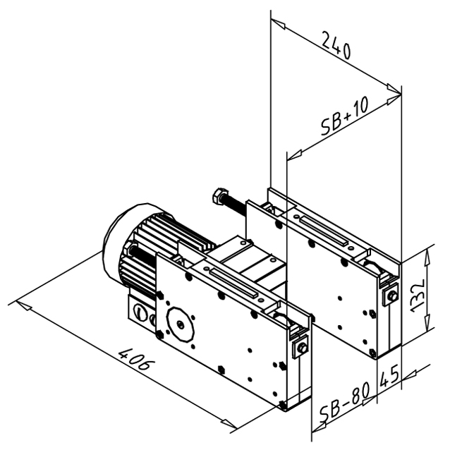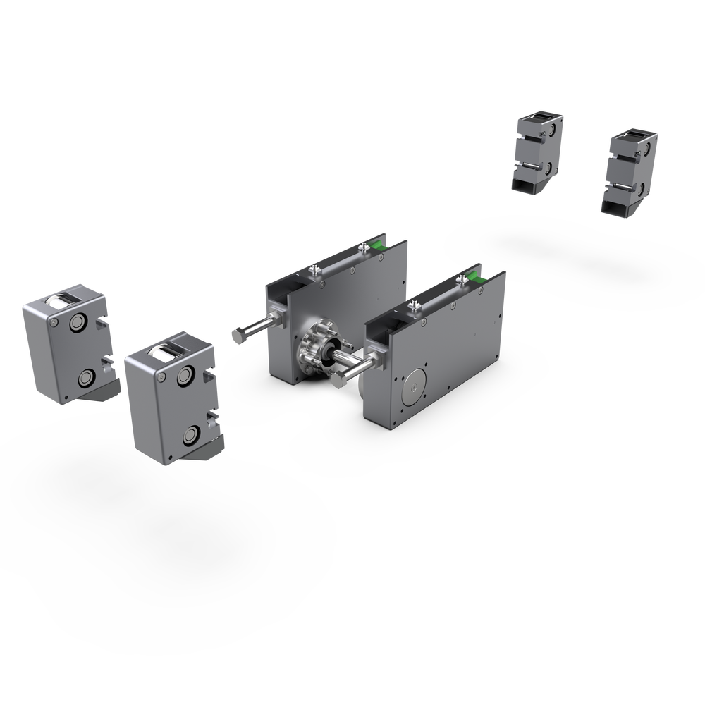 • Pogonska enota z integriranimi napenjalniki jermena, sestavljena iz 2 povratnih enot s povezovalno gredjo