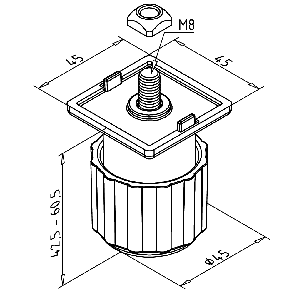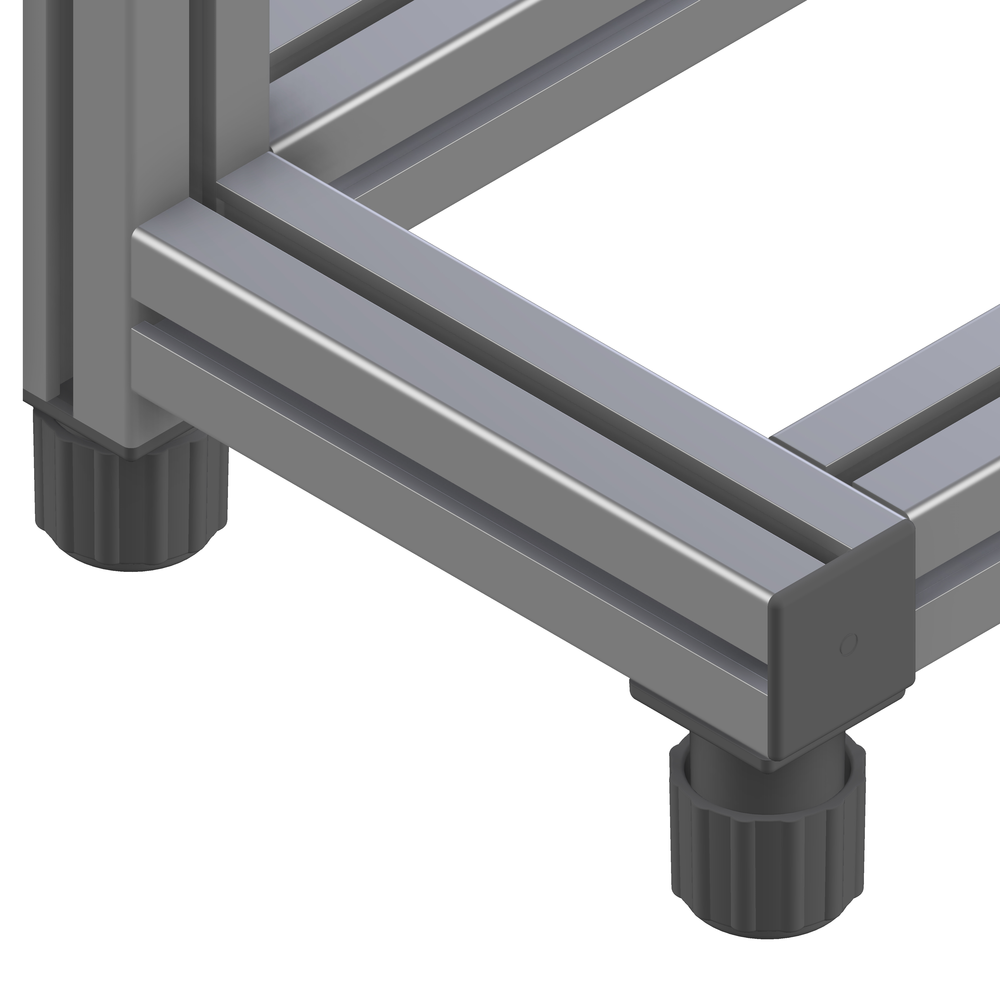 Kompaktna nastavljiva noga za aluminijaste profile serije 45, ki zagotavlja stabilno in estetsko pritrditev manjših konstrukcij v industrijskih aplikacijah.