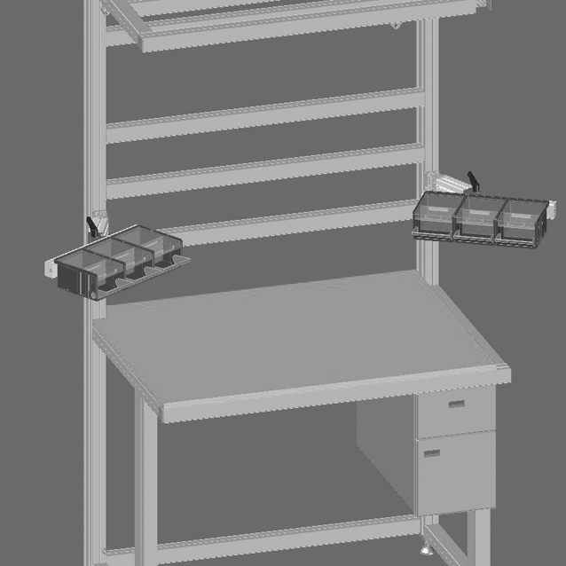 Nosilec za 3 zaboje za vijake s pomično roko za fleksibilno postavitev materiala za boljšo ergonomijo na delovnem mestu.