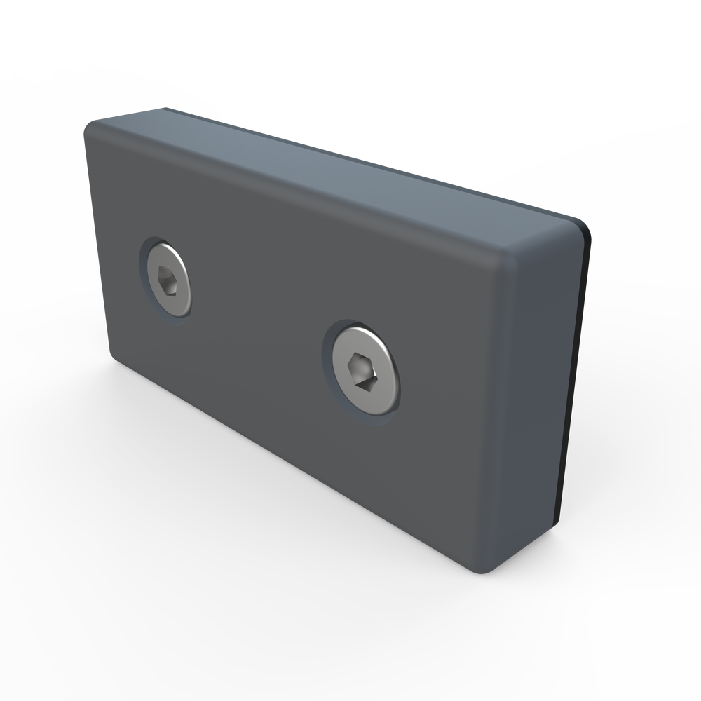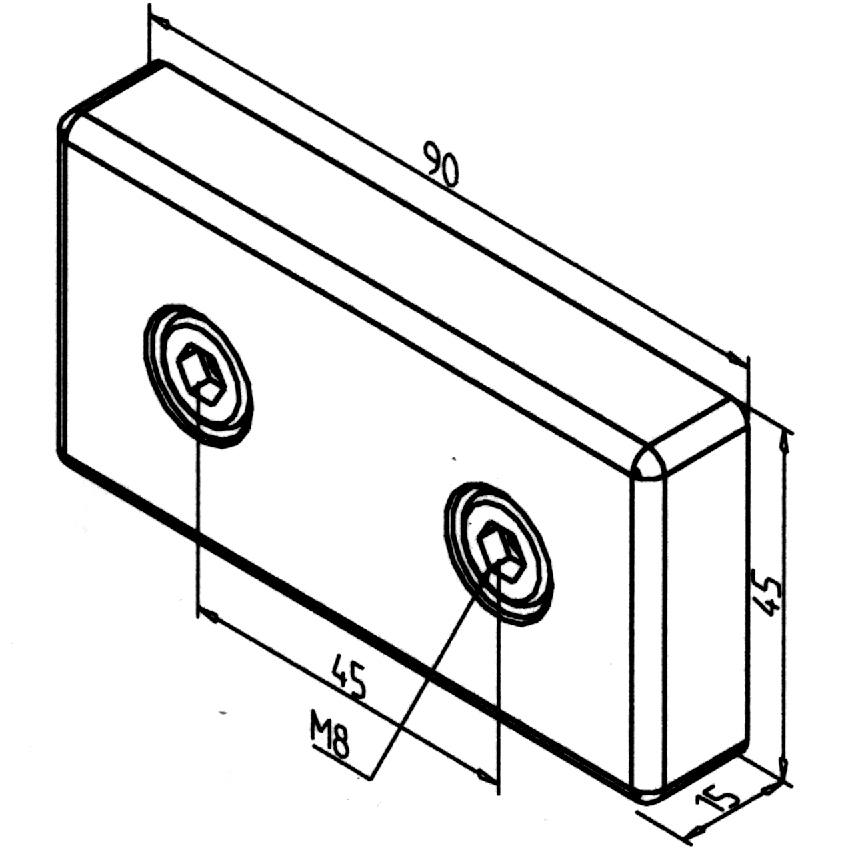 Pnevmatska zaključna plošča dimenzij 45 x 90 mm, namenjena zapiranju in zaščiti pnevmatskih komponent v konstrukcijah.