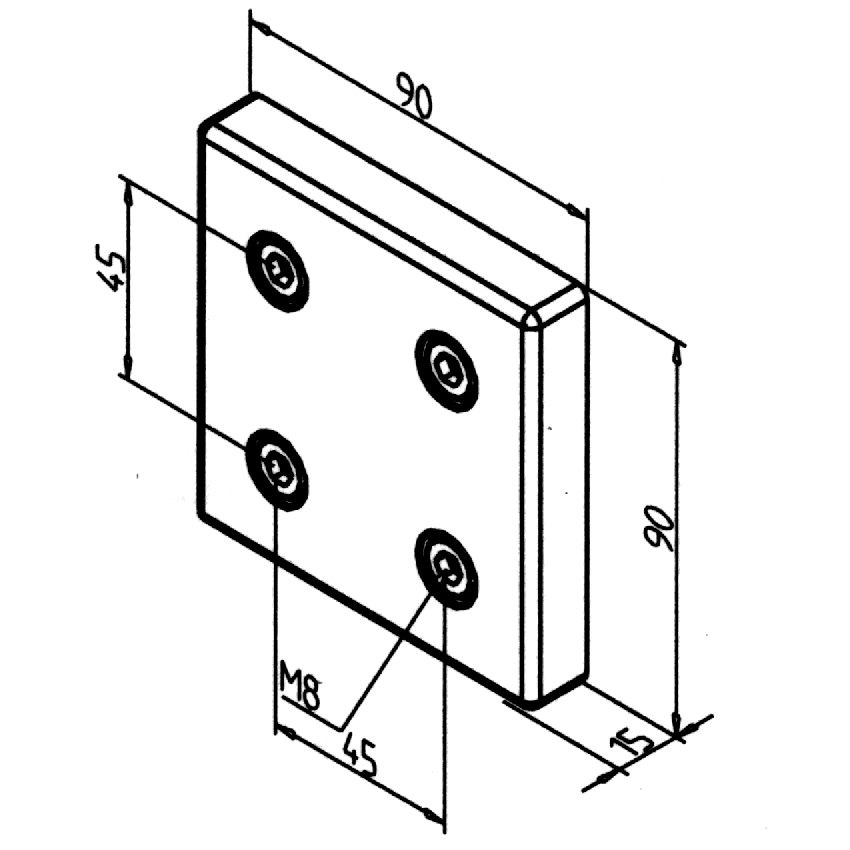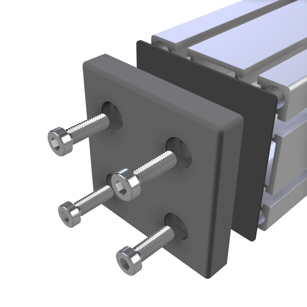 Pnevmatska zaključna plošča dimenzij 90 x 90 mm, namenjena zapiranju in zaščiti pnevmatskih komponent v konstrukcijah.