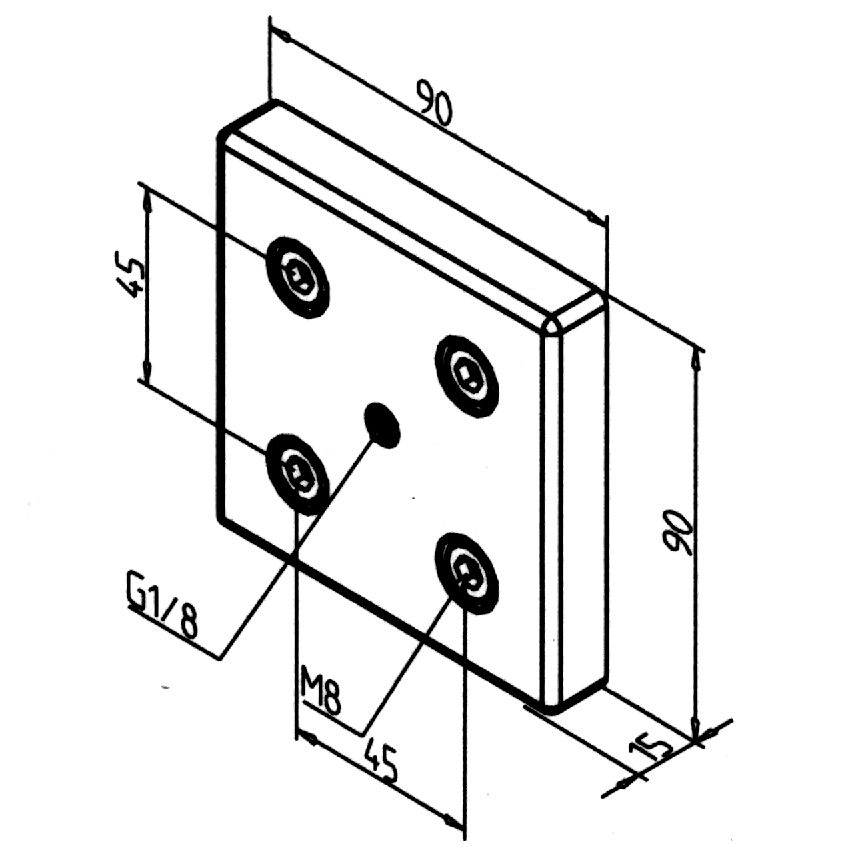 Pnevmatska osnovna plošča 90x90 z navojem G1/8" za enostavno pritrditev in povezavo pnevmatskih komponent v profilnih sistemih.