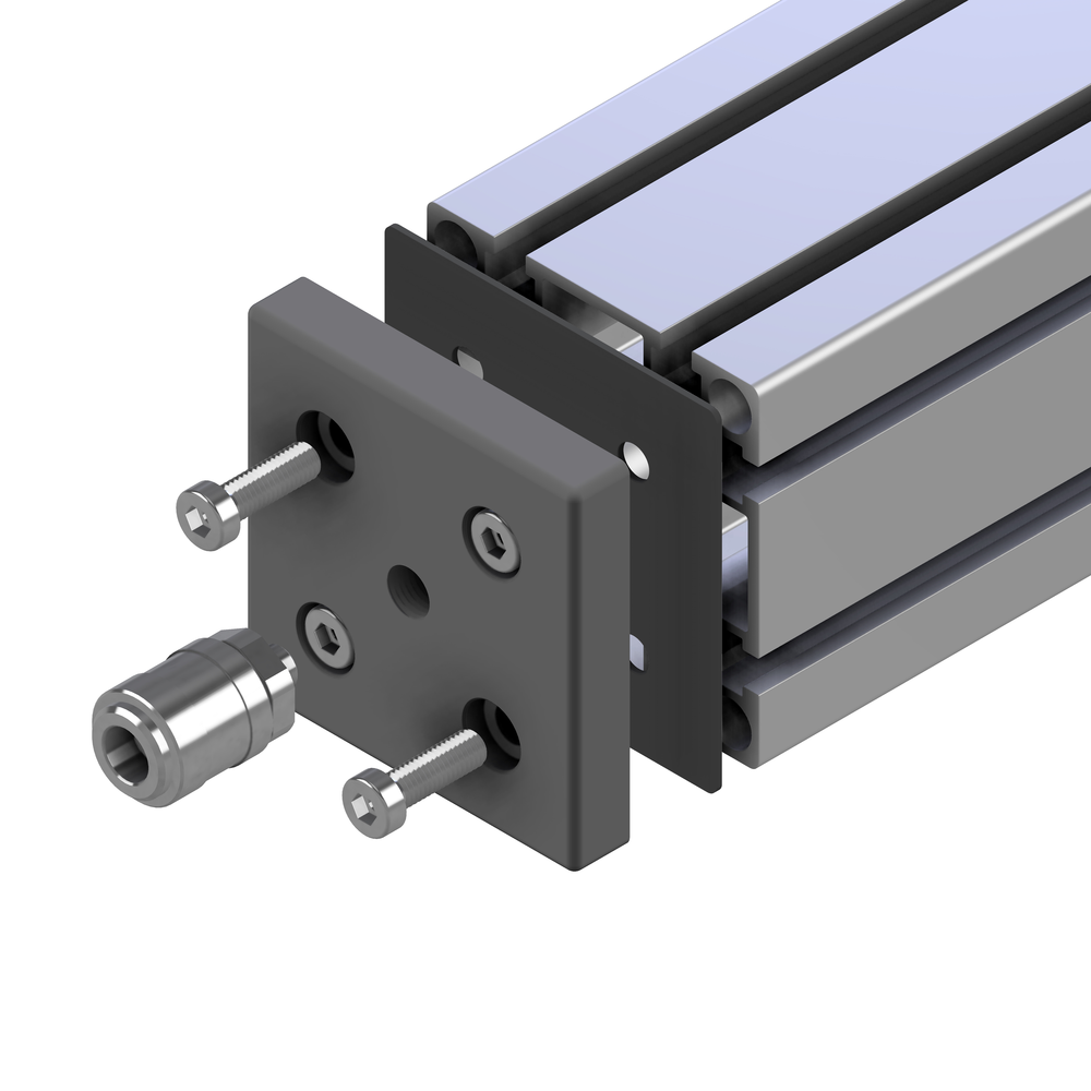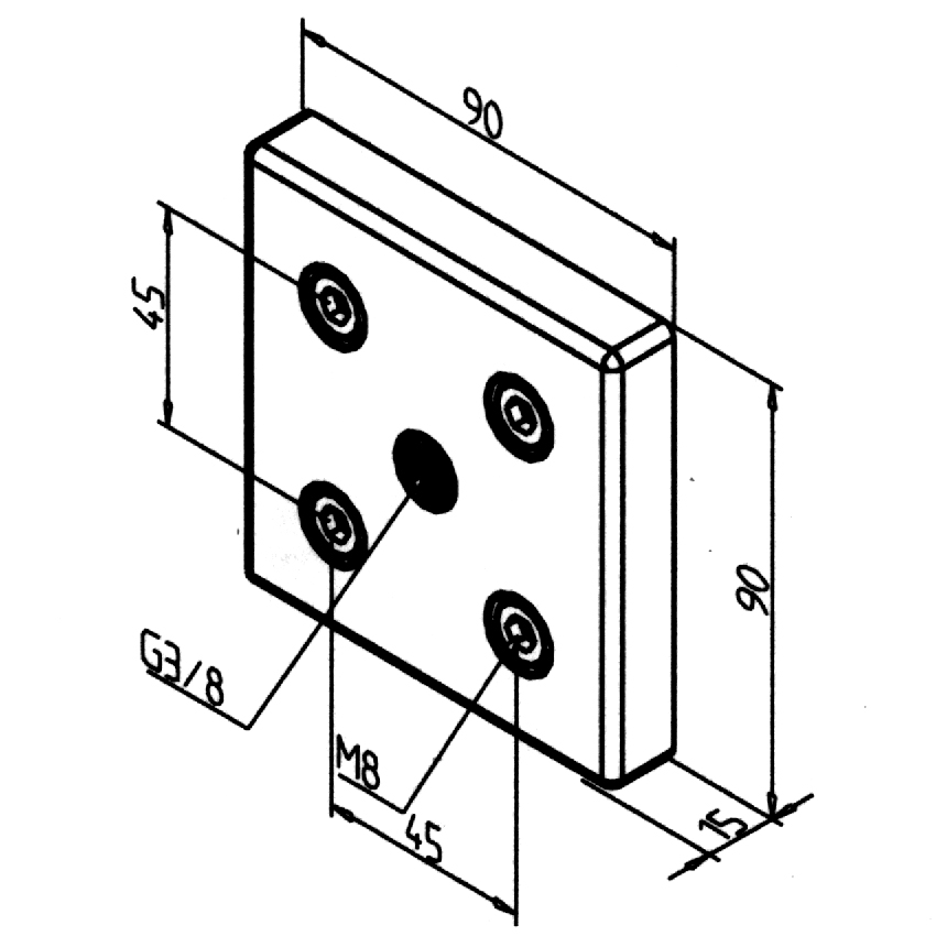 Pnevmatska osnovna plošča 90x90 z navojem G3/8" za enostavno pritrditev in povezavo pnevmatskih komponent v profilnih sistemih.
