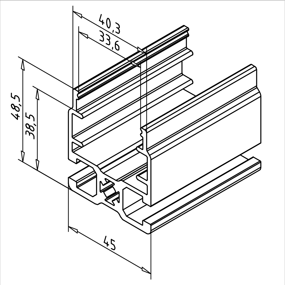 Alu profil 45 FRS omogoča izdelavo valjčnih trakov v različnih konfiguracijah ter zagotavlja zanesljivo konstrukcijo in hitro montažo.