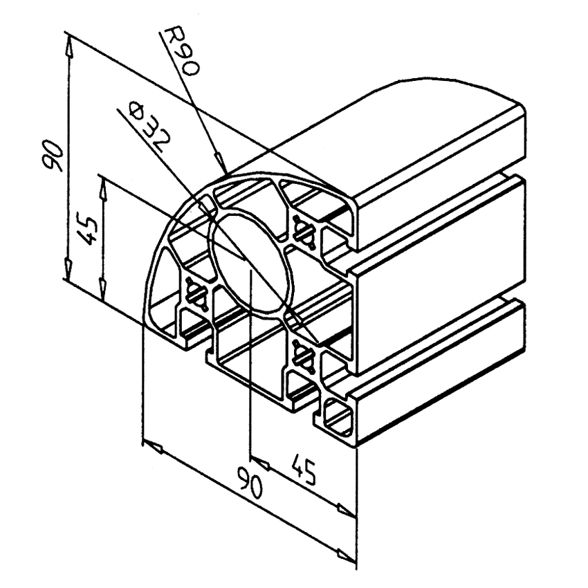 Alu profil 90 R 90° za trdne konstrukcije in enostavno sestavljanje. Alu profili za sestavljanje in konstrukcije za industrijo in strojegradnjo.