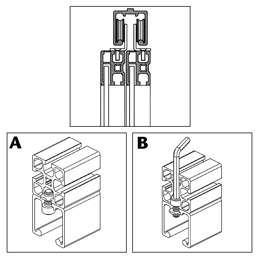 • B) Izvrtajte skozi ali stopničaste luknje v nosilni profil in vstavite kvadratno matico v profil drsnika. Matice so odporne proti vrtenju