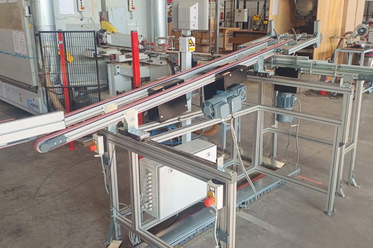 Za naročnika smo zasnovali in izdelali rešitev za transport laminata različnih dimenzij. Sistem vključuje dva, po širini, nastavljiva jermenska transporterja in en tračni transporter, ki skupaj zagotavljajo poravnavo, obračanje in dvigovanje laminatov na višino naslednjih obdelovalnih centrov.