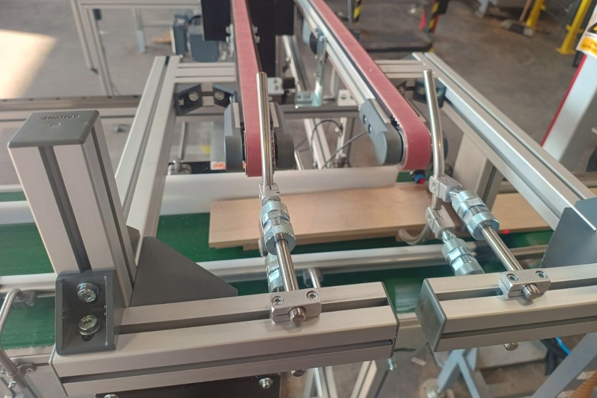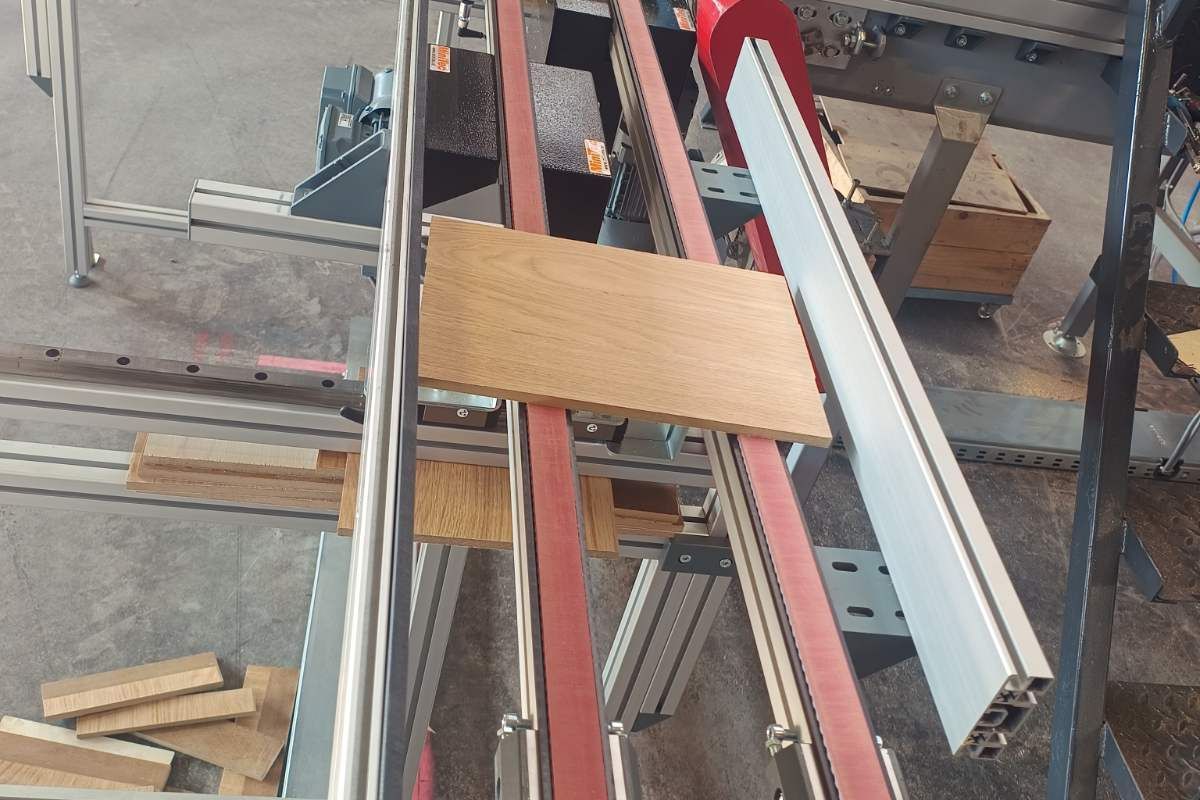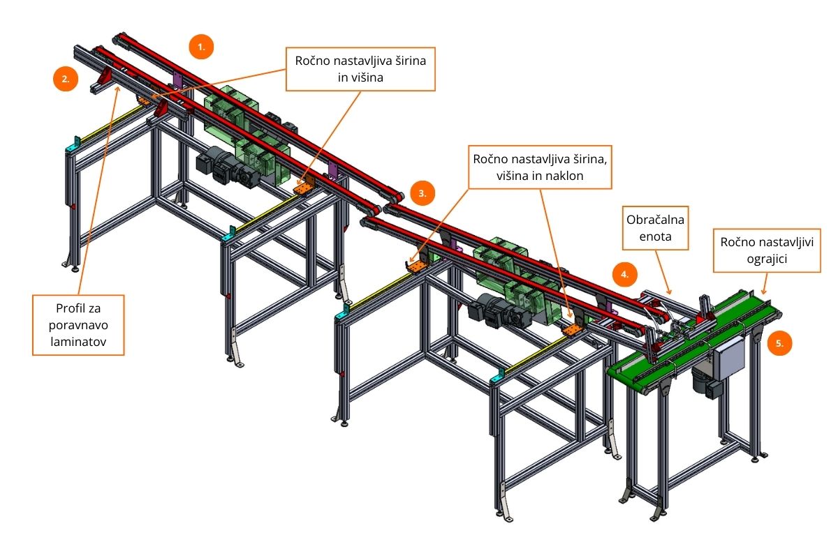 Rezultat - izdelali smo ročno nastavljiv in sinhroniziran sistem treh transporterjev, ki zagotavljajo tekoč, stabilen in natančen transport laminatov od razreza do obdelave. Rešitev omogoča pozicioniranje in transport laminatov med različnimi višinami ter zanesljivo podajanje v obdelovalni stroj brez potrebe po ročnem posredovanju. S hitrim in enostavnim nastavljanjem širine transporterjev smo naročniku omogočili učinkovite prehode med različnimi dimenzijami laminatov, kar bistveno izboljša pretočnost linije in skrajša čas priprave procesa.