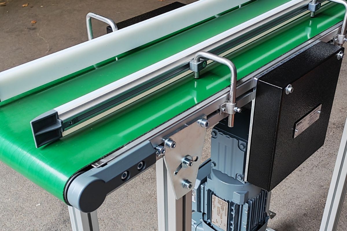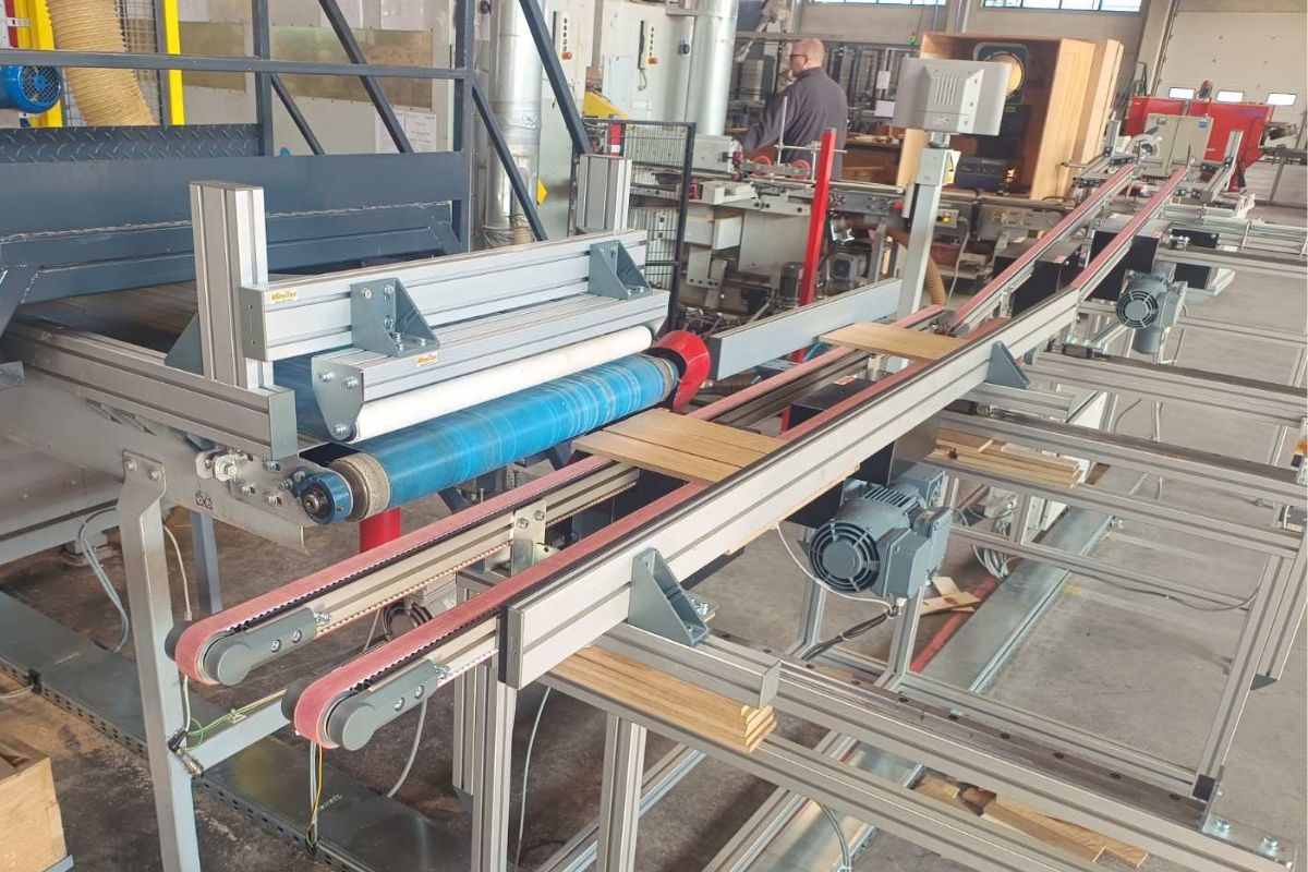 Tračni transporter z zelenim PVC trakom sprejme obrnjen laminat in ga pripelje do obdelovalnega stroja. Stranski ograjici ohranjata laminat na sredini transportne poti, tudi pri višjih hitrostih.