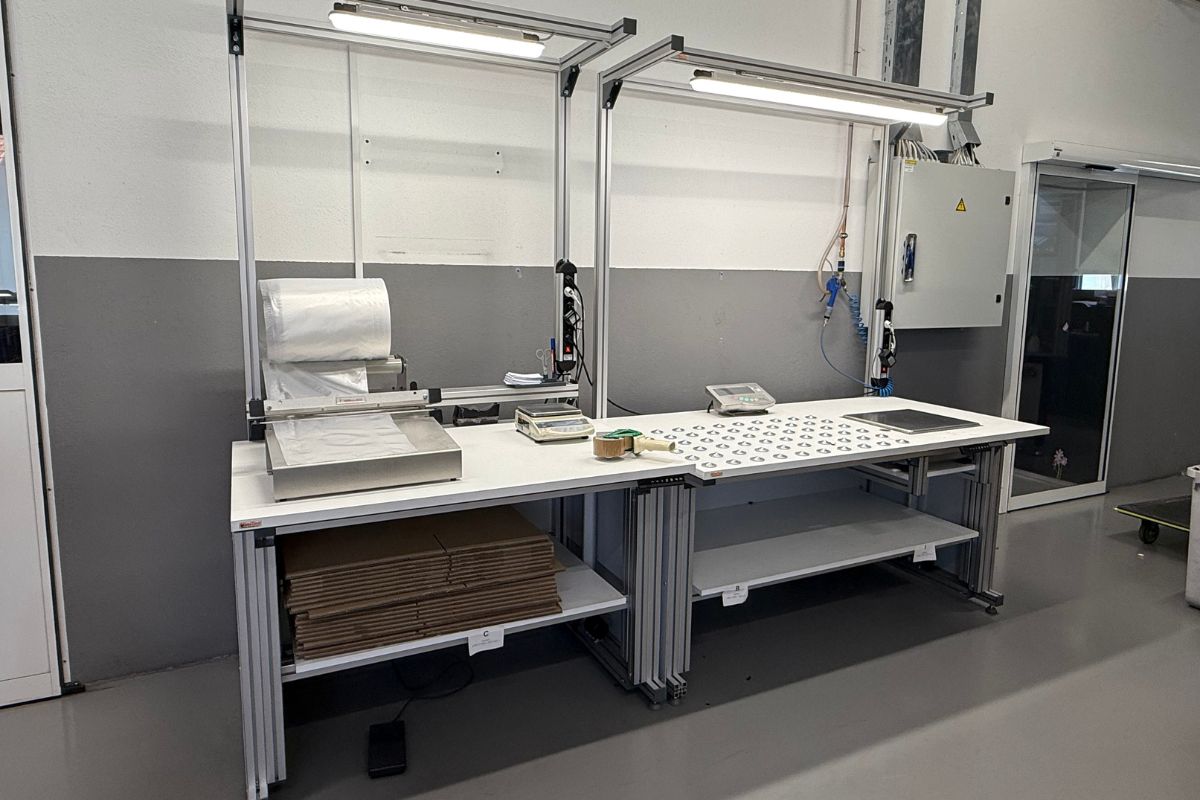 Poleg delovnega mesta za tehtanje smo razvili tudi delovno mesto za pakiranje z identičnimi nastavitvami mize in dodali nosilec za folijo.