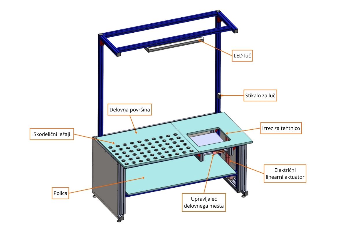 Rezultat - razvili smo električno nastavljivo delovno mizo z integriranimi skodeličnimi ležaji za prosto premikanje paketov, LED osvetlitvijo za manjšo obremenitev oči in spominskimi nastavitvami višine za 4 različne operaterje. Delovno mesto združuje stabilnost, ergonomijo in praktičnost ter omogoča hitrejši, bolj učinkovit in prijeten delovni proces.