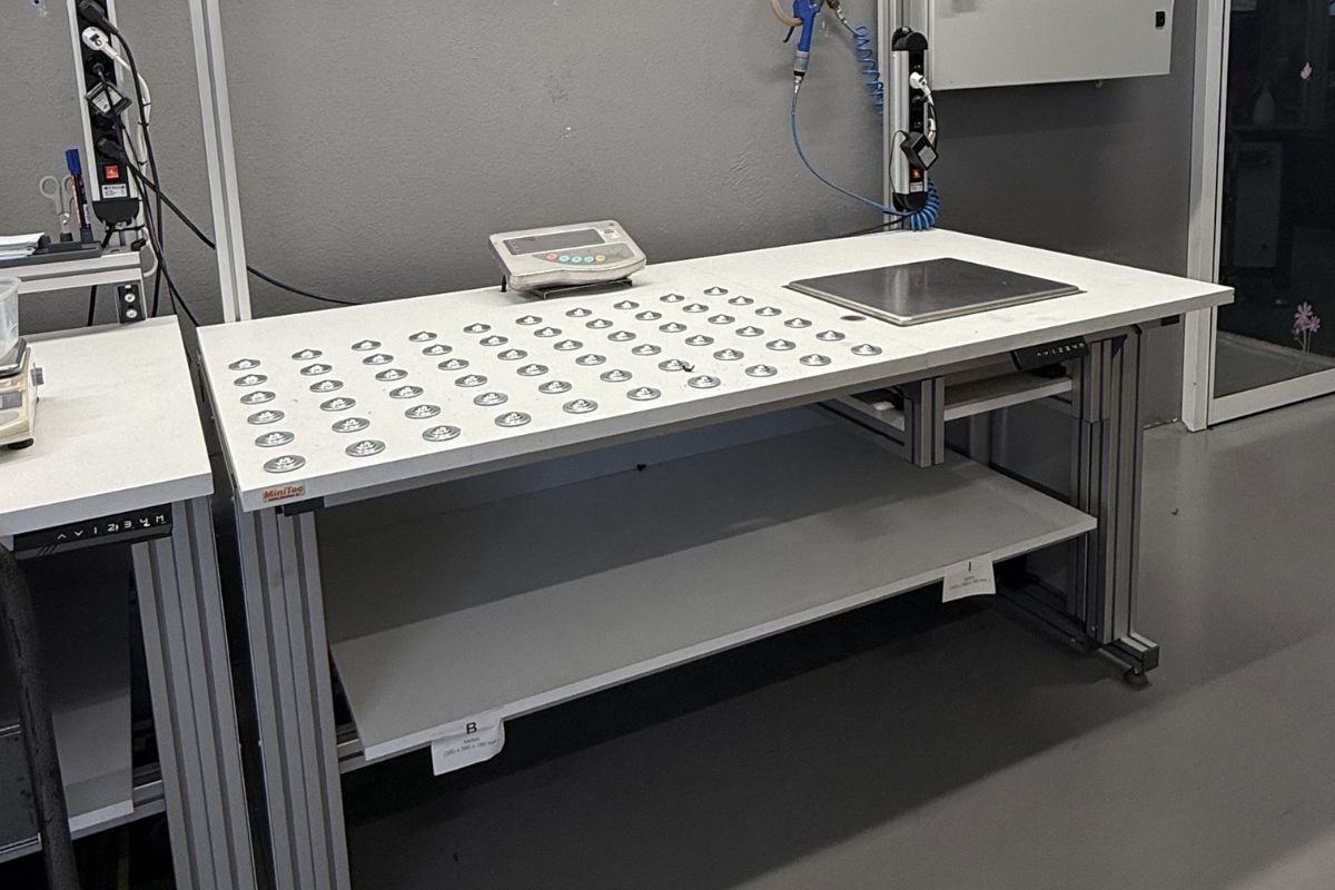 Za naročnika smo razvili namensko delovno mizo za tehtanje materiala v pakirnih škatlah. Miza omogoča ergonomično in enostavno tehtanje paketov, hkrati pa omogoča priročno manipulacijo paketov ter urejeno shranjevanje pripomočkov.