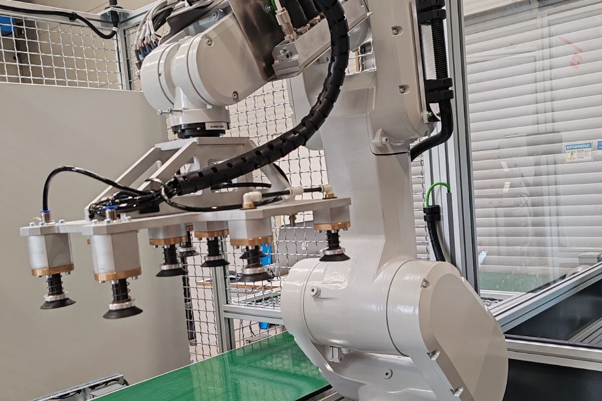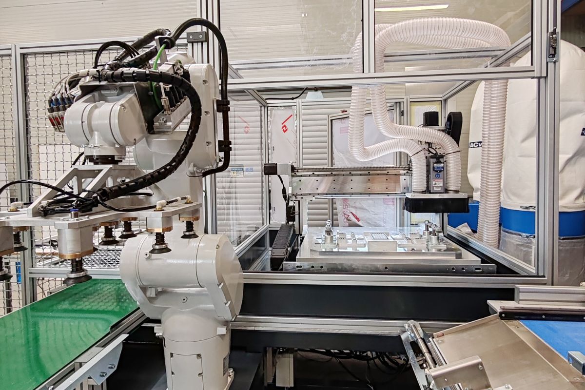 Robotski prijemalni sistem uporablja posebej razvito večstopenjsko vakuumsko prijemalo, zasnovano zaradi občutljive površine kosov (že polirane na visoki sijaj), različnih dimenzij in potrebe po visoki dinamiki manipulacije. Takšna izvedba omogoča zanesljiv oprijem brez poškodb površine ter prilagoditev širokemu dimenzijskemu razponu vzorcev. Robot zagotavlja hiter, natančen in varen transport surovcev in obdelanih kosov med vsemi moduli linije.