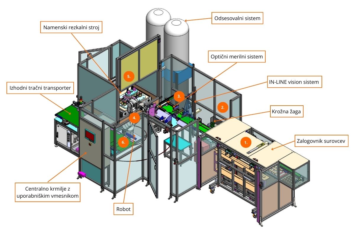 Izhodiščni izziv - Pred avtomatizacijo so obstoječi postopki zahtevali šest delavcev in dve izmene dela, pri čemer je bilo brušenje večstopenjsko in dolgotrajno. Naročnik je iskal rešitev, ki bi omogočila: avtomatizacijo celotnega procesa, povečanje kapacitete, konstantno kakovost obdelave površin ter zmanjšanje ročnega dela in nepotrebnih transportov.