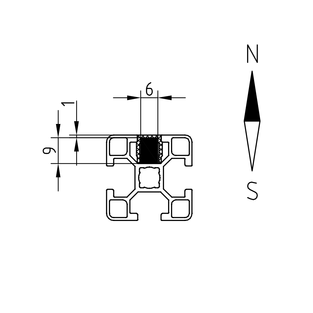 Compact adhesive magnet for tools and precise tracking under conveyor belts, compatible with all profile series 30.