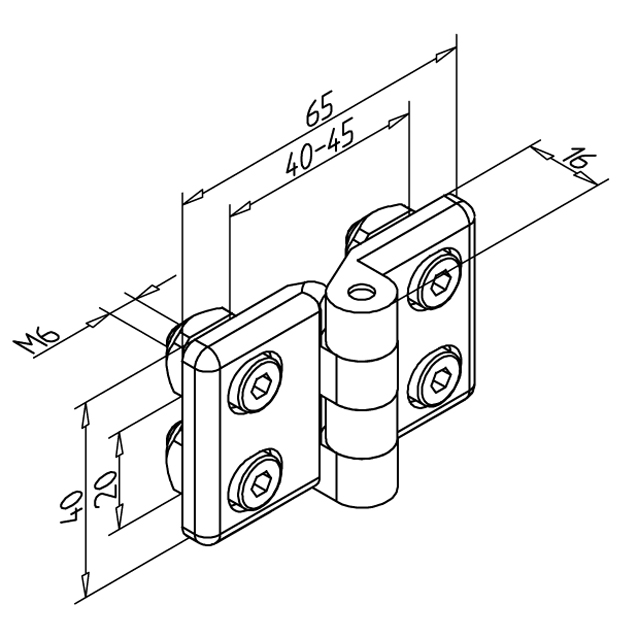 Kompakten tečaj 45 M6 za lahka vrata in pokrove iz aluminijastih profilov. Zanesljiva povezava in enostavna montaža v zaščitnih sistemih.