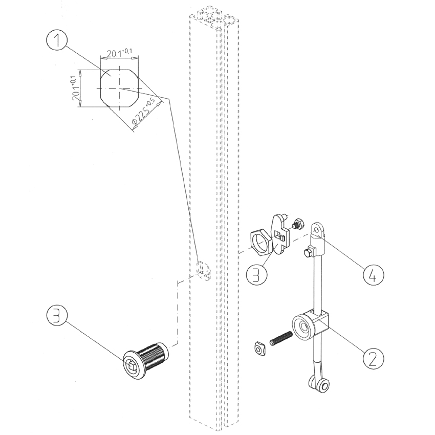 Privijte nastavljivi vijak M6 x 30 v vodilo palice, na nastavljivi vijak rahlo privijte matico, v utor vstavite kvadratno matico in pritrdite vodilo palice na mestu. Privijte ročni zatič na ročni ključ ali ročaj. Vstavite palico z odbojem v vodilo palice in jo pritrdite na ročni zatič