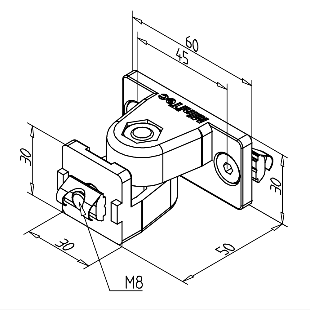 Zglob za alu profile 30 F/S omogoča gibljivo, zanesljivo in trdno povezavo aluminijastih profilov za prilagodljive in vzdržljive konstrukcije.